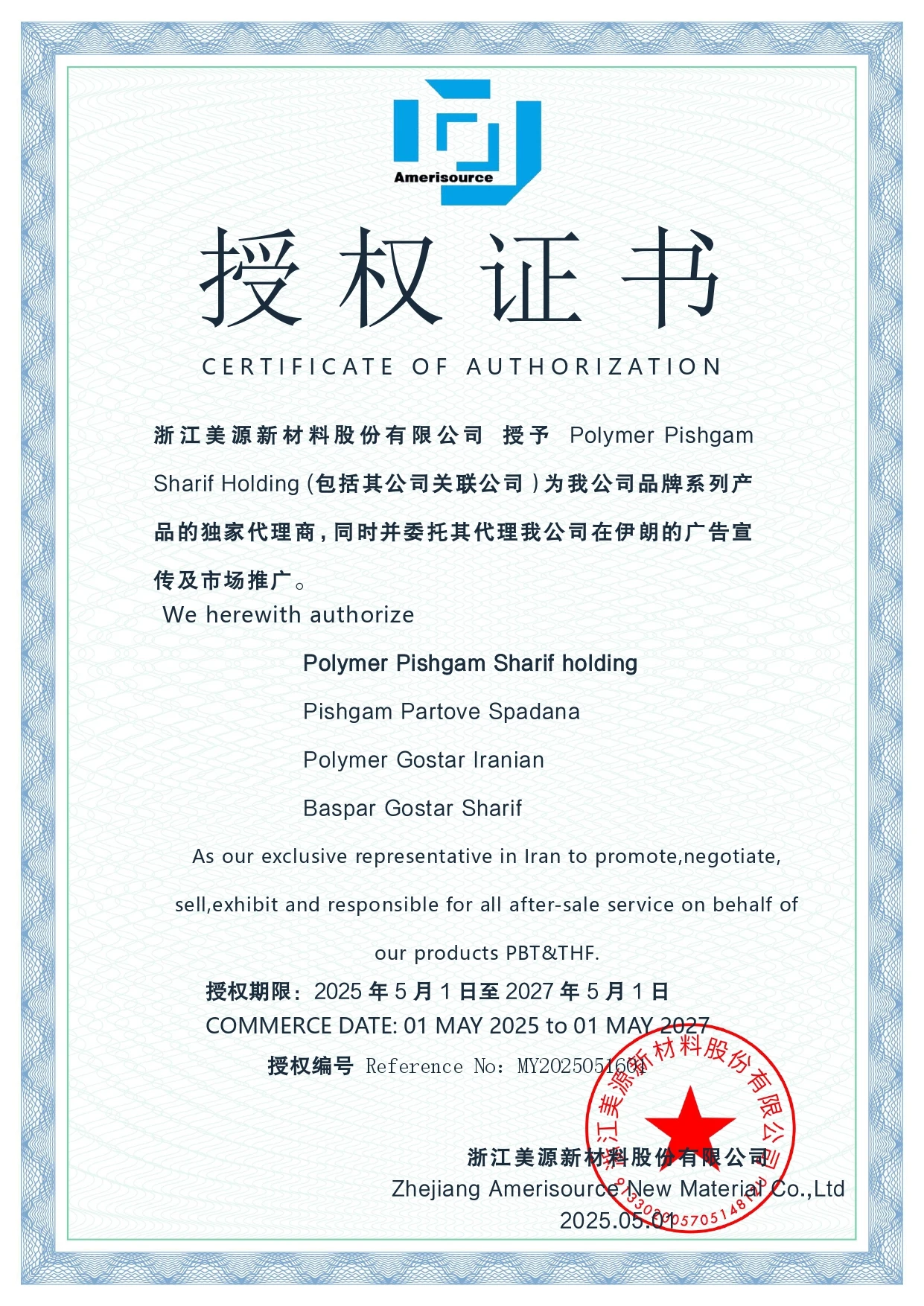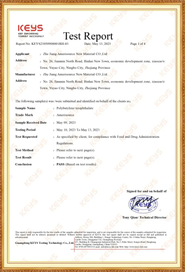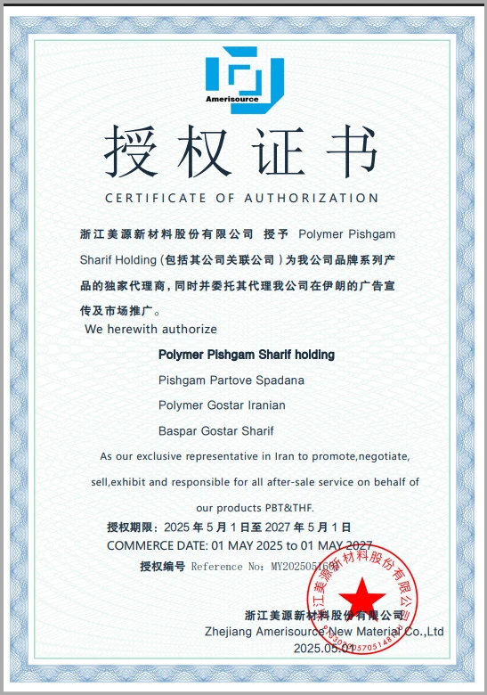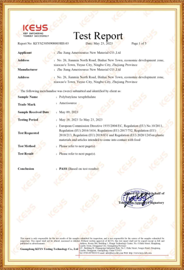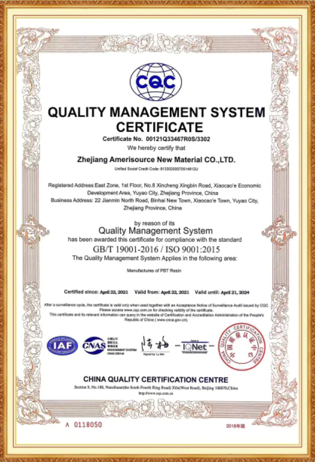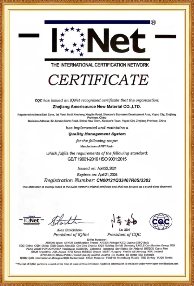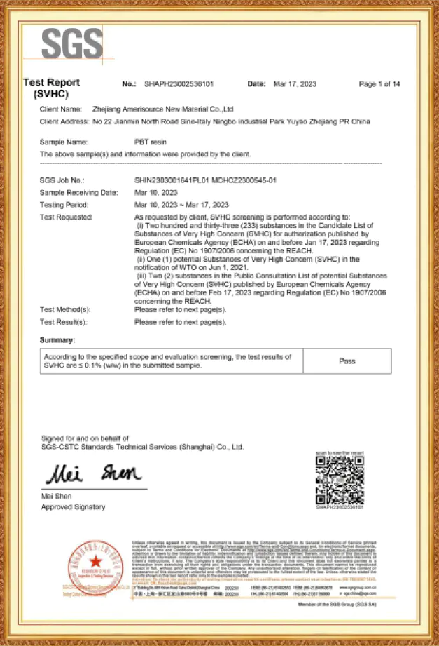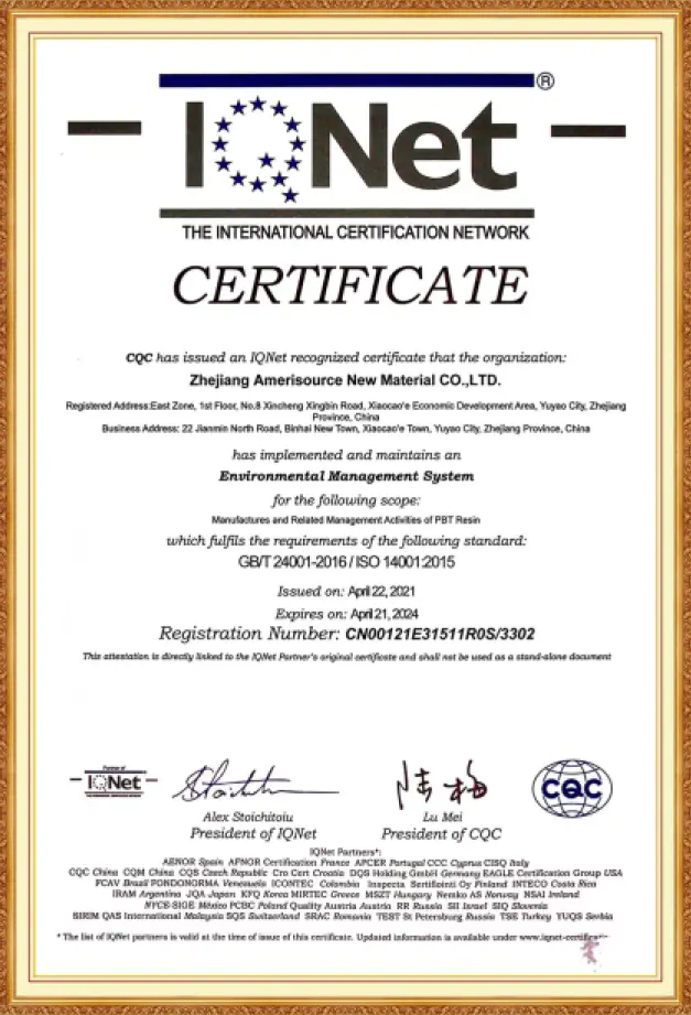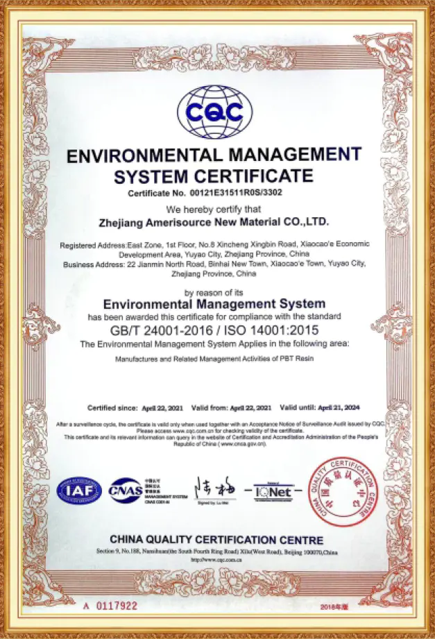 محصولات رزین PBTشرکت آمری سورس، دارای گواهینامه ثبت REACH، گواهینامه RoHS، گواهینامه SVHC ونیز گواهینامه اتحادیه اروپا می باشند. این شرکت همچنین گواهینامه سیستم مدیریت کیفیت ISO 9001 و گواهینامه سیستم مدیریت زیست محیطی ISO 14001 را دریافت کرده است. هنگامی که مشتریان محترم، نیازمند الزامات خاص صدور گواهینامه مشتری باشند ، این شرکت پذیرای درخواست های ایشان بوده و گواهینامه های بین المللی مورد نیاز را به مشتریان ارائه می دهد.